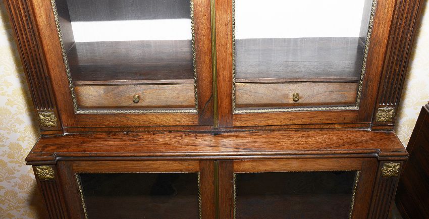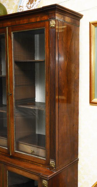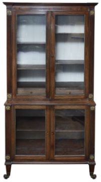 A George III rosewood display cabinet c.1800 the projecting moulded cornice brass strung frieze and a pair of glazed doors enclosing adjustable shelves and two short drawers, flanked by reeded pilasters with foliate mounts, conforming lower section with two glazed doors, on square tapering legs ad brass bucket feet and castorsheight 180 cm., width 82.5 cm., depth 37 cm. Condition: Overall good condition. Fading to interior drawer frontsPurchased by the vendor from Norman Adams c.1975Please note this lot needs to be collected and paid for by Friday 11th September 4:30pm