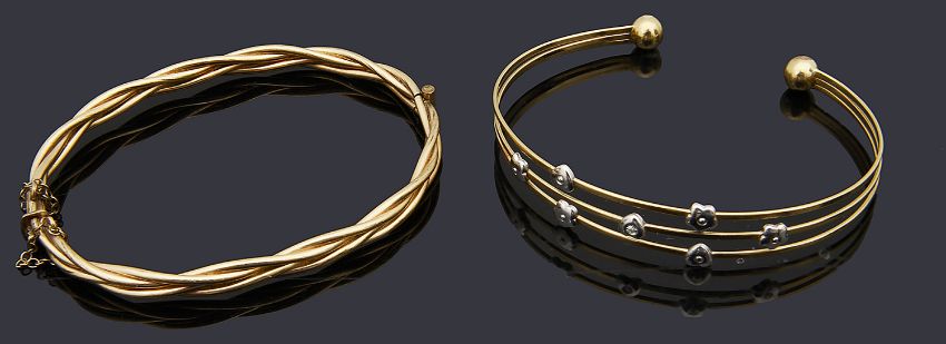 Two bangles to include a three row twisted wire bangle and another three row tapering bangle with applied white gold flowers (2)