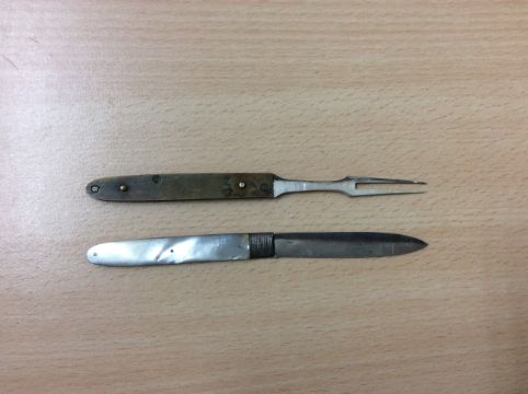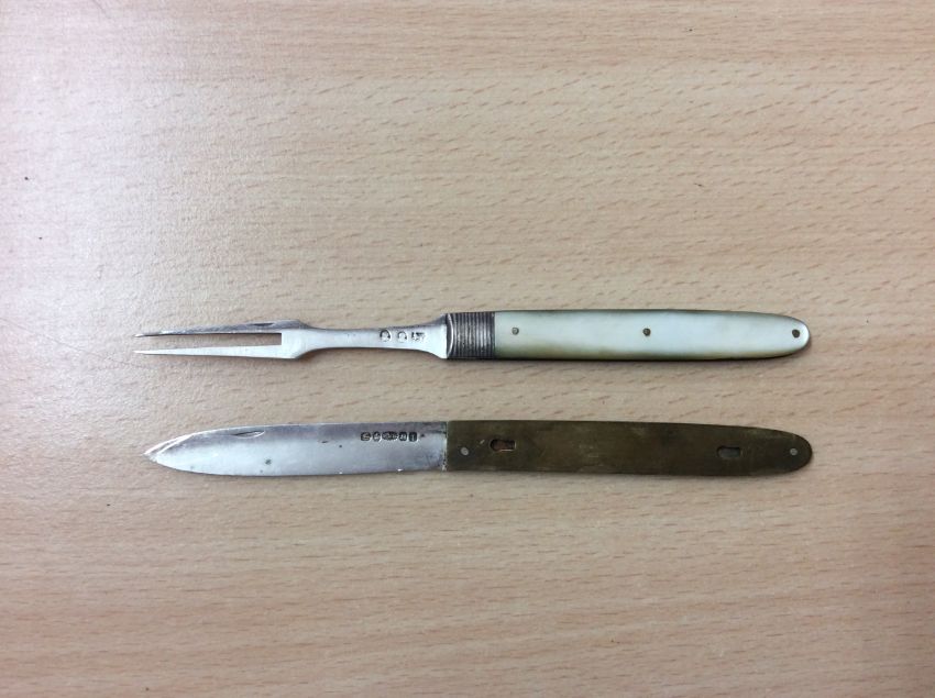 Condition: Campaign knife with a later silver knife blade. Other knives in good condition with some light scratches to blade