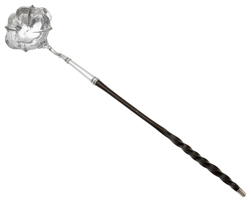A George II silver punch ladleLondon, 1748 by Edward Aldridge,shaped double lipped oval bowl engraved with initials, having bifurcated mount and twisted baleen handle with plain end ferulelength 44 cm.Condition: Historic repair to bowl joint with stem