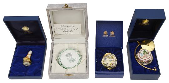 A collection of Halcyon Days boxed enamels including a parrot scent bottle inspired by 18th Century Chelsea Miniatures together with a limited edition Royal Yacht Britannia snuff box (141/750), a 1997 Christmas Tree Ornament (numbered 624/750), a 1979 Easter Egg, a small mouse enamel and a Happy Birthday pill box (unboxed), a Mazzega Murano paperweight presented on the 400th Anniversary of Child & Co. Bankers (1584-1984), A Child & Co. Bankers commemorate silver medallion and a silver cigarette case (9)Condition: All in good overall condition although some tarnish to gold gilt on the bottom of the parrot scent bottle, some damage to the Easter Egg both internal and external.