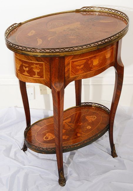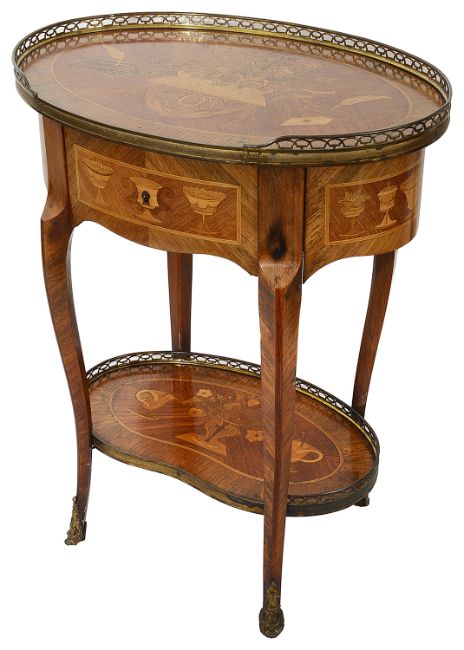 A late 19th century French Louis XVI style kingwood and marquetry oval occasional table the gilt brass pierced galleried top marquetry inlaid with a flower basket, books, quills and a letter, above a frieze drawer and a kidney shaped stretcher shelf, on slender cabriole legs with brass feetheight 76.5 cm., width 61.5 cm., depth 42.7 cm.Condition: good condition. Occasional water marks to top. Key PresentPlease note this lot needs to be collected and paid for by Friday 11th September 4:30pm