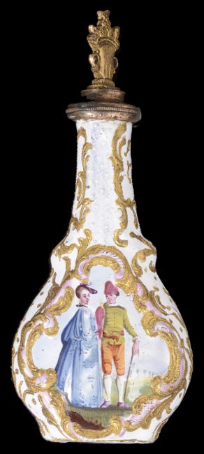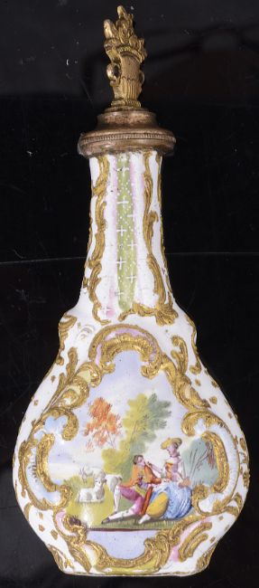 A good 18th century Bilston enamel scent bottle c.1760 of flattened pear form, the white ground painted with to one side in bright enamel with a courting couple after 'La cascade' after Watteau, the other with a couple in a pastoral landscape with goats within moulded gilt scroll and bianco-sopra-bianco diaper borders, the gilt metal stopper in the form of a vase of flowers