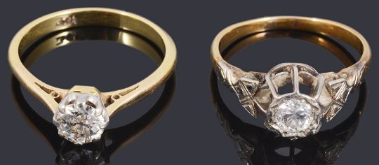 Two single stone diamond ringsto include an Art Deco single stone diamond ring with raised gallery to a yellow shank and a single stone diamond ring, claw set to chenier shoulders and a polished shank marked 18ct (2)Art deco ring weight apporx: 2.4g, single stone weight: 2.9gCondition: Art deco shank tests as approx 18ct and plat.