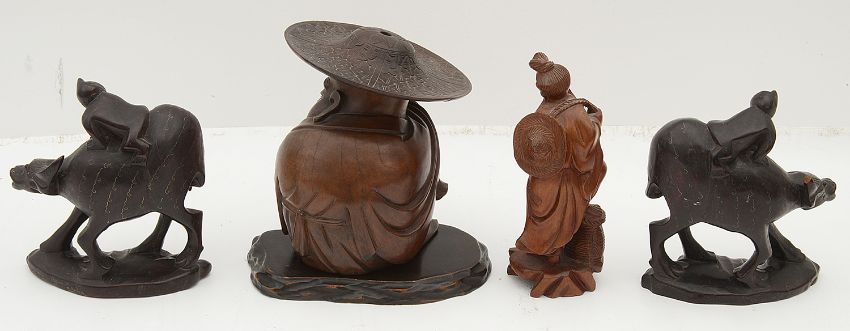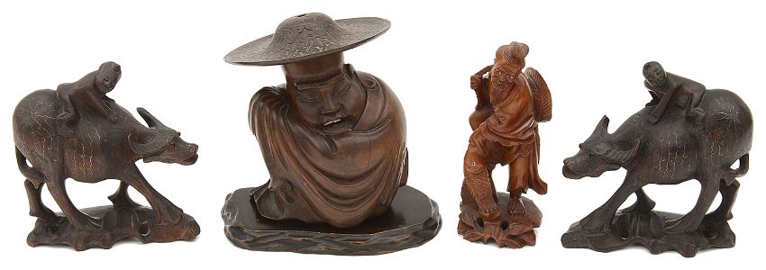 A small collection of late 19th/early 20th century Chinese hardwood carvings comprising a figure of a sleeping immortal wearing a wide brimmed hat and wrapped in a cloak, a pair of wire inlaid figures of buffalos with riders and a carving of a fisherman with his catch, (4)first height 16 cm. Condition: Sleeping immortal with absent finial to hat. One buffalo with small loss to one horn,