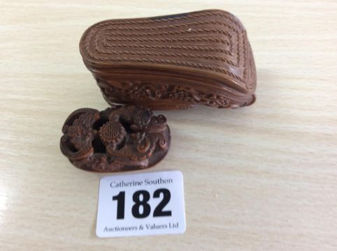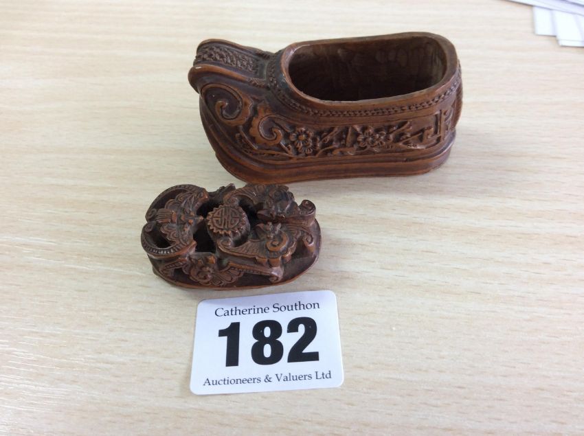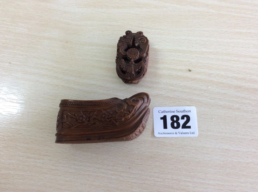 A 19th century Chinese Qing dynasty carved coquilla nut shoe shaped snuff box finely carved with flowering prunus, the cover pierced and carved with bats