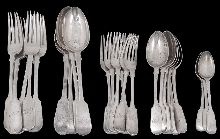 A Victorian part canteen of silver fiddle pattern flatware Exeter, 1874 by Josiah Williams and Co.engraved with initials, comprising five dinner forks, six dessert forks, six dessert spoons, five tablespoons and three teaspoons, (qty)length of tablespoons approx. 21.7 cm., weight approx. 56.29 ozt.Condition: One teaspoon near matching. Bowls of three tablespoons with dings