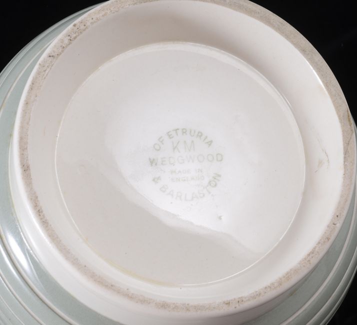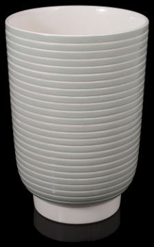 A Keith Murray for Wedgwood vaseof cylindrical form, celadon glazed over cream with incised banded decoration, on a circular foot, printed and impressed marksheight 18 cm.Condition: Fair condition. Small area of restoration to inside of foot