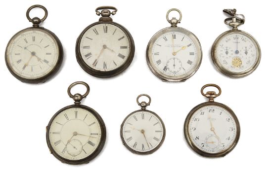 A collection of silver pocket watches to include a silver Kendal & Dent open faced key wound pocket watch, with white enamel dial and roman numerals signed to the dial ' Makers to the admiralty, the London Lever', London import silver mark to the inside, A Victorian silver open faced key wind patent lever chronograph pocket watch, white enamel dial with roman numerals with centre seconds dated 1885, a continental silver Helvetia Prima open face pocket watch with Arabic numerals and a subsidiary dial, together with three other silver pocket watches and chrome Yards open faced measuring implement, in the form of a pocket watch, white enamel dial signed Yards with two subsidiary dials each inscribed 'Miles' (qty)