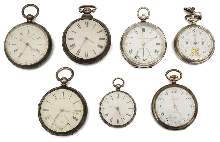 Condition: Kendal & Dent dial in good condition, case has dents and evidence of wear consistent with age, patent lever chronograph, wear and dents to the back case, Helvetia prima, glass cracked and tarnish, all the others have wear and none are guaranteed to keep time.