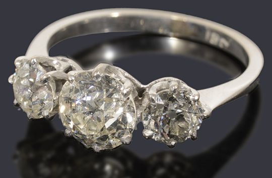An impressive three stone diamond ringthree old European cut diamonds, claw set with knife edge shoulders and a plain polished shank marked 18ctApproximate estimated diamond weight: principal diamond 1.33ct flanked by approx: 0.48ct and 0.51ct. Total weight: 2.31ct.Clarity and colour grading approximately: principal diamond P1-P2 and J-L, both colour/ clarity grade as approx: SI2-P1 J-L. Total weight: 2.7gCondition: Approximate estimated diamond weight: principal diamond 1.33ct flanked by approx: 0.48ct and 0.51ct. Total weight: 2.31ct.Clarity and colour grading approximately: principal diamond P1-P2 and J-L, SI2-P1 and SI1-P1, both colour grade as approx: J-L