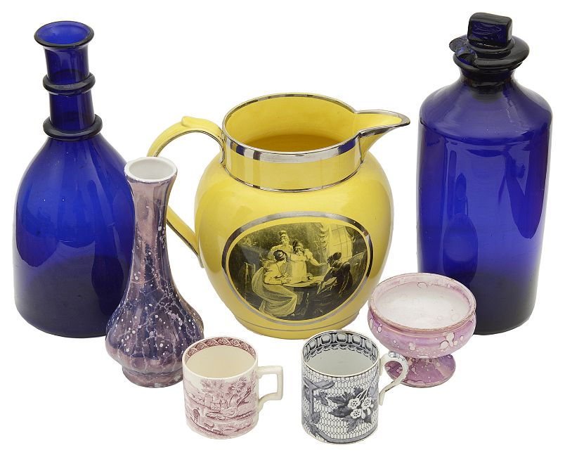 An early 19th century Staffordshire silver lustre canary yellow pearl ware jug together with Bristol blue glass decanter and other early 19th century potterythe jug c.1810 decorated with an oval transfer print in black depicting an interior scene with four ladies gathered round a table with trapped mouse, together with a Bristol blue mallet shaped decanter (no stopper) c.1800, and a chemists bottle and stopper, a Sunderland pink lustre pedestal salt, a pink lustre lobed bottle vase, a transfer decorated pearlware coffee can etc., (7)first height 16 cm.Condition: Canary yellow jug with two hairlines running down rim to top of shoulder, and a small chip on rim near spout. Chemists bottle with chipped stopper