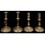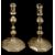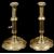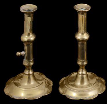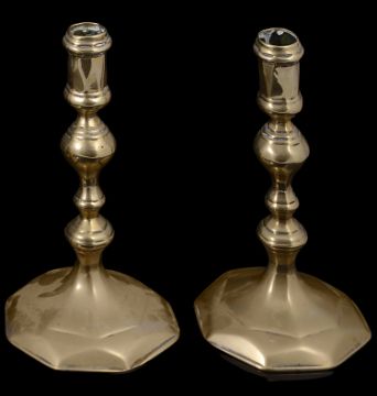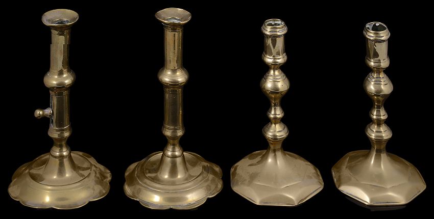 Two pairs of George I and II brass candlesticks the first c.1715 with faceted octagonal bases, the seamed knopped stems and nozzles also faceted, the second a matched pair c.1750, with petal shaped bases and slide ejectors, (4)first height 16 cm., second height 17 cm.Condition: First pair base of one is slightly buckled but still sits flat. Second pair, one has a cast base, the other is spun, both with slight rings around nozzle rim
