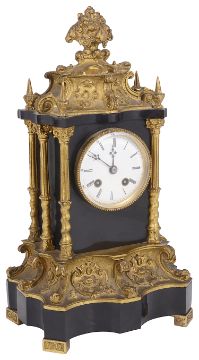 Condition: Bell has been removed. Movement winds but is untested. Pendulum present but winding key absent. Finial to to left of case has been glued back to case with slight damage to marble. Scratch to glass dial cover