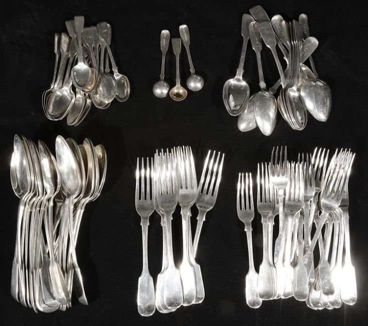 An extensive early Victorian matched silver canteen of fiddle pattern flatware