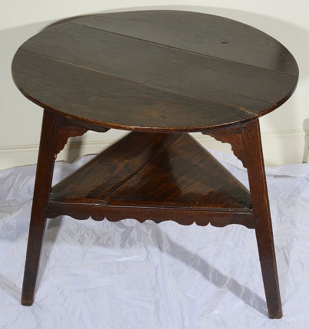 A George III oak cricket table the circular three plank top over three splayed legs and an under tier with a fret cut apronheight 68 cm., diameter 70 cm.Condition: Fair condition commensurate with age.Due to the size, collection is required by 4pm on Friday 6th from Farleigh Court Golf Club