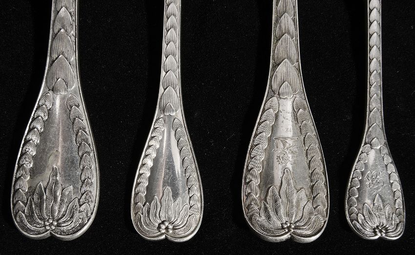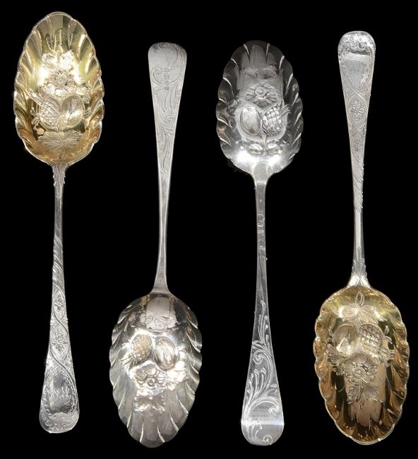Four George III silver Old English pattern tablespoons with later embossed berry and chased foliate decoration