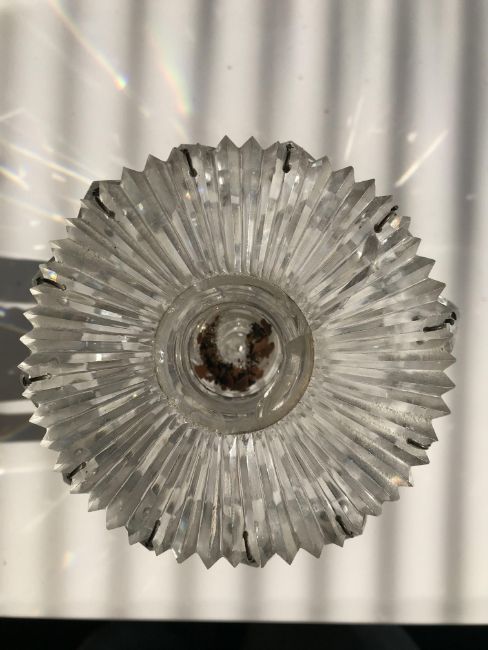 Condition: One drip pan has historic hairline cracks most likely caused by heat, these are entirely stable otherwise in fair condition commensurate with age with minor fleabite chips. The drip pan of the other candlestick has similar faults but is now broken into three detached sections, these are clean breaks with no major losses and could be repaired. All drops are present, this lot is now sold as seen.
