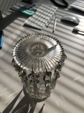 the wide ray cut drip pan suspended with a single row of twelve tear shaped prismatic drops, on tapering step cut hexagonal stems, and bases cut with strawberry diamonds, (2)