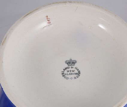 blue ground, with a white and gilt rope pattern border to the rim and base and an abstract border to the centre and gilt handles, printed marks, (2)