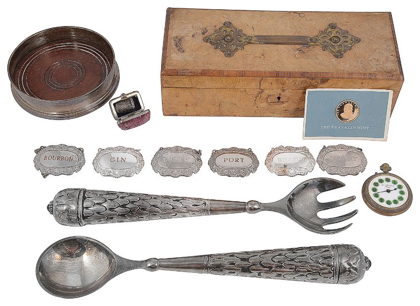 comprising a contemporary silver bottle coaster, a set of six silver plated bottle tickets 'Bourbon', 'Gin', 'Whisky', 'Port', 'Brandy' and 'Sherry', a pair of plated salad servers, an open faced pocket watch, a silver-gilt Franklin Mint coin, a thimble in a case and a Victorian burr walnut glove box (qty)