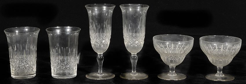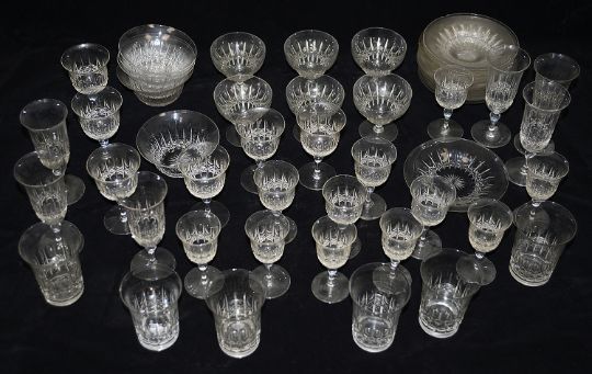 An extensive Edwardian part suite of cut table glass each piece with band of printies and mitre cut decorationcomprising ten champagne, twelve white, eight red, eleven port, nine sherry, seven water beakers, twelve finger bowls and twelve plates, (81)height of white 15.5 cmCondition: Three water beakers with a chip to rim. One finger bowl with a large chip to rim. Five plates with slight chips to rimPlease note that due to the size, collection is required by 4pm on Friday 6th at Farleigh Court Golf Club