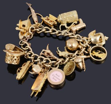 A 9ct gold charm bracelet with padlock and charms