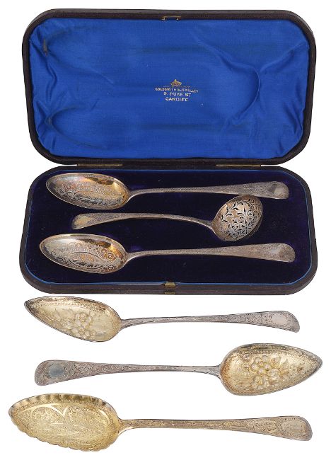 first, the spoons, London, 1795 by Richard Crossley, in a fitted cased retailed by J.T. Barry, 9 Duke St Cardiff, a pair of George III tablespoons, London, 1805 by Thomas Streetin, the gilt bowls embossed with flowers and a parcel gilt spoon, with foliate chased decoration and scalloped bowl, engraved 24th October 1874. over 24th October 1926, (6)