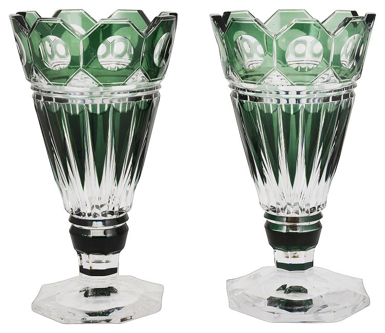 A pair of early 20th century Belgian Val St Lambert emerald green overlaid cut glass trumpet shaped vases