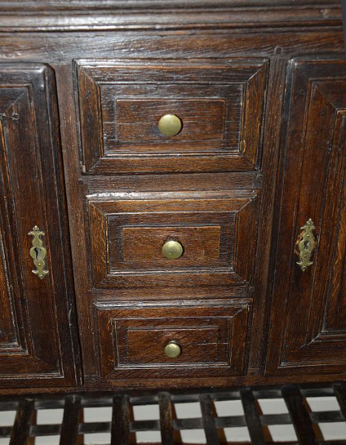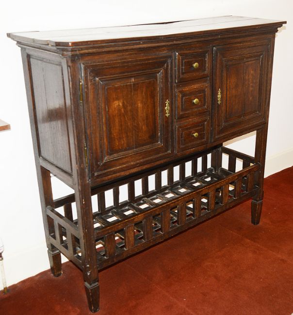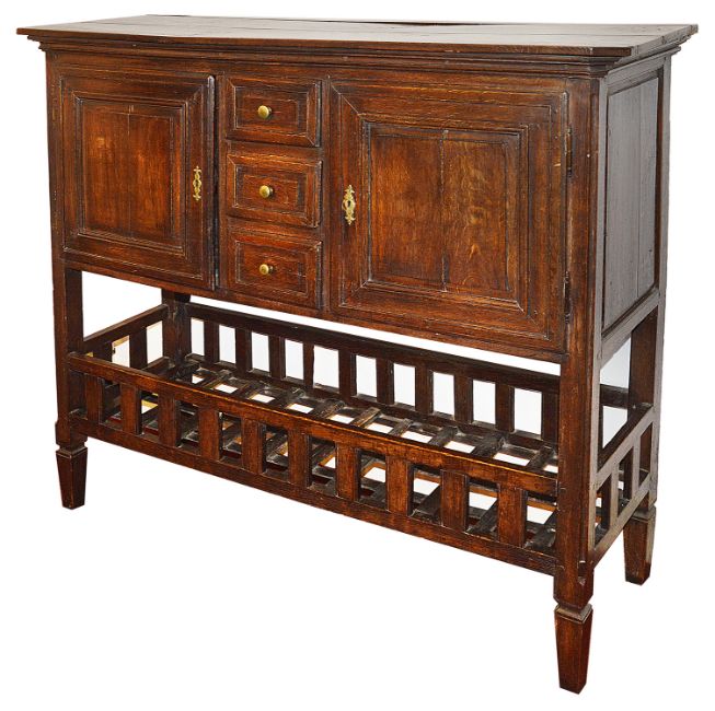 An early 19th century French provincial oak kitchen dresserhaving three central short drawers flanked by a pair of cupboards with fielded doors above a slatted manger, on square tapering feetheight 124 cm.m width 141 cm., depth 47 cm.Condition: Overall in fair condition. Both cupboards have replacement locksPlease note that due to the size, collection is required by 4pm on Friday 6th at Farleigh Court Golf Club