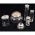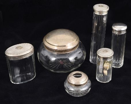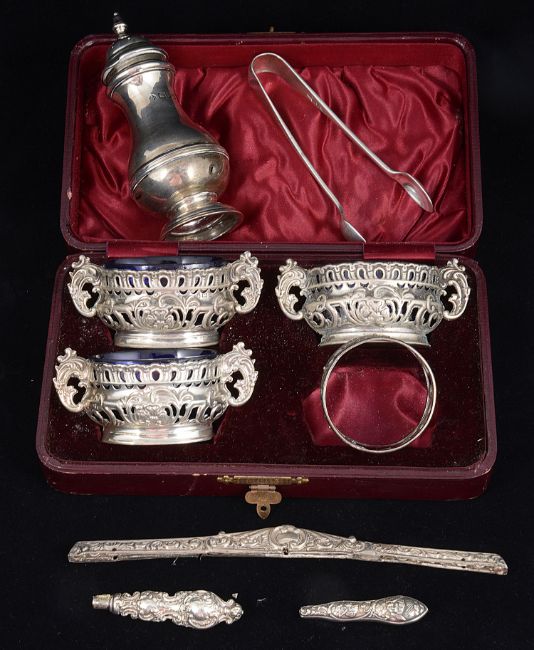 to include three twin handled silver salts with pierced and scroll embossed decoration fitted with blue glass liners in a fitted case, Birmingham, 1901 by Reynolds & Westwood, a George II style baluster form pepper pot, London, 1898 by William Hutton & Sons, three dressing table jars with engine turned silver tops, initialled U.P, a silver mounted powder pot etc., (qty)