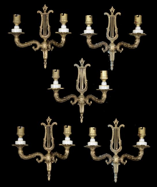 A set of five mid 20th century twin branch wall lightswith lyre backs, (5)height 24 cm. width 23 cm. Condition: Overal fair condition. One light has some verdigris to the lyre, another with some areas with verdigrisPlease note that due to the size, collection is required by 4pm on Friday 6th at Farleigh Court Golf Club