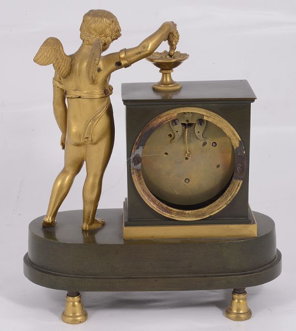 A Regency ormolu and patinated bronze figural mantel timepiece
