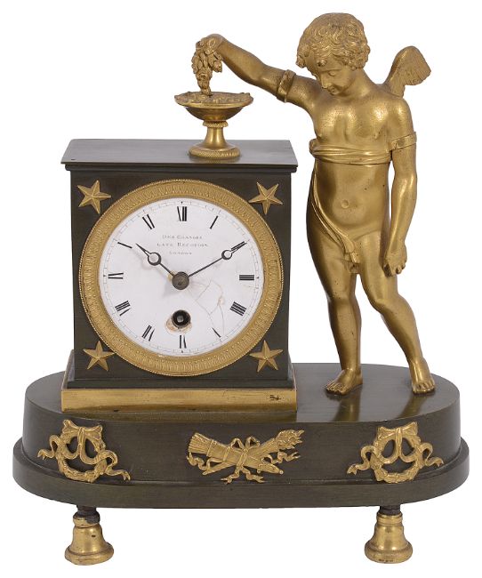 the white enamel dial with black Roman numerals, minute track and steel hands, signed Des Granges Late Recordon, London, chain fusee drum movement, the Empire style rectangular case having stars to corner spandrels, to the side a standing winged Eros picks up flowers from a tazza on top of the case, on a plinth base with rounded ends with ribbon tied wreath and crossed flaming torch and quiver of arrows appliqués, on bell feet