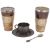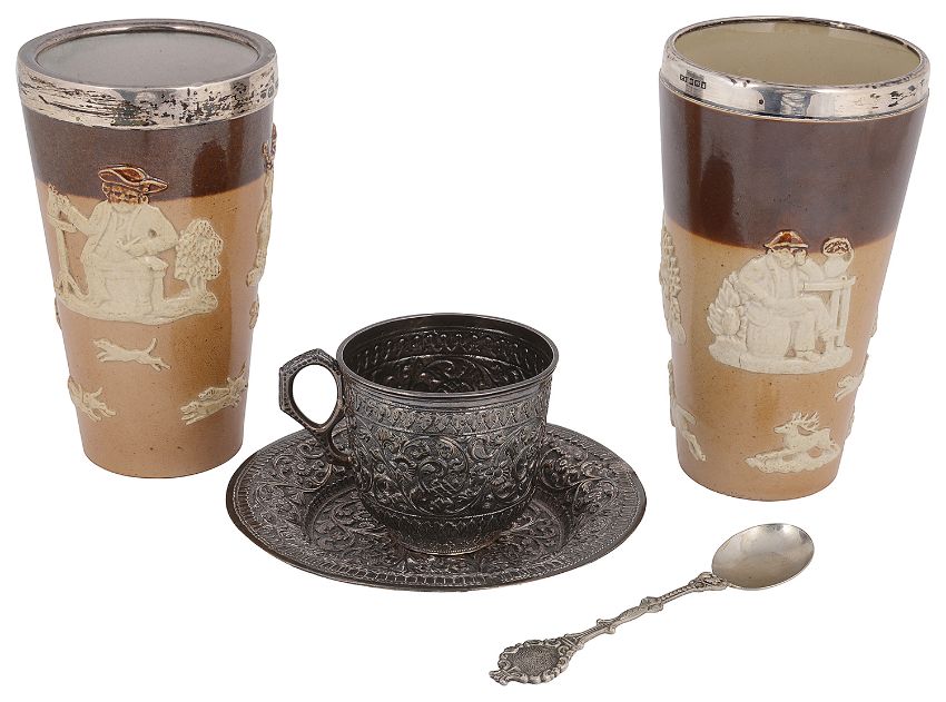 A late 19th century Indian Kutch silver teacup and saucer and two silver mounted Doulton stoneware beakers