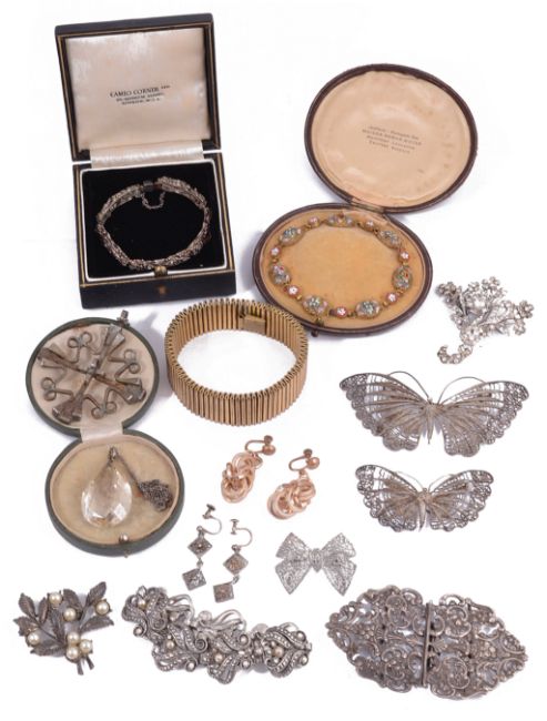 to include a sterling silver and cultured pearl panel bracelet with a newspaper clipping saying it is by Mr. John Baldwin who had his work exhibited at Cameo Corner, London, contained in a Cameo Corner box,