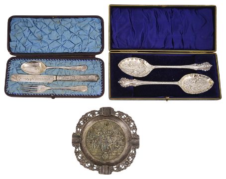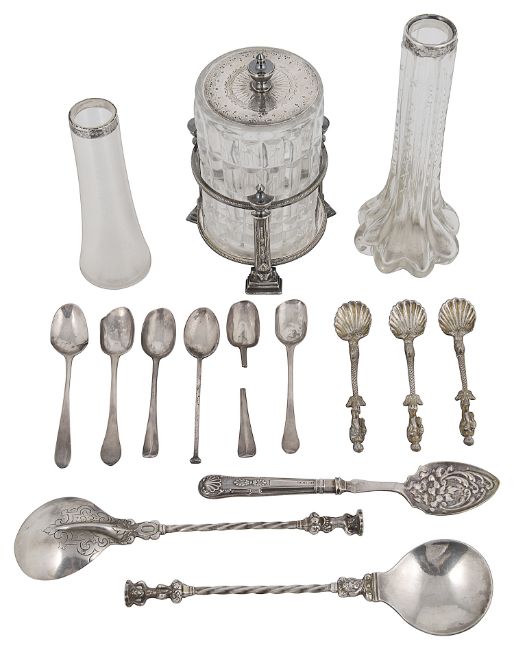 A pair of silver seal top spoons in 17th Century French style, three silver gilt, three silver gilt apostle renaissance style apostle salts spoons and a selection silver and plated items. the first, Hanau marks, having foliate engraved spoon back and barley twist ends with barley twist stems and figural seal top finial in from of a seated putto, crested, second, Hanau marks, having shell bowls, dolphin stems and figural apostle terminals, together with assorted mostly a/f silver teaspoons, two silver mounted glass specimen vases and a Victorian electroplated and moulded glass preserve pot, a pair of cased plated serving spoons, the bowls embossed with irises and a cased plated christening set, (qty)