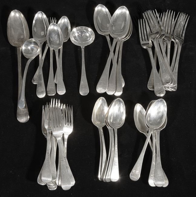 comprising six tablespoons, twelve table forks, twelve dessert forks, six dessert spoons, a pair of sauce ladles and a basting spoon, initialled together six matched George IV dessert spoons, London, 1826 by William M Traies, (45)