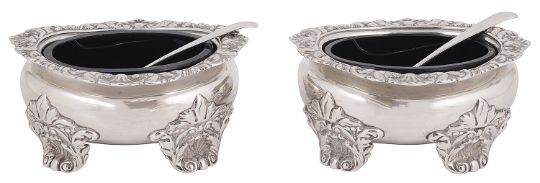 of circular design with reticulated scroll framed ovals and pierced foliate scroll decoration, on splayed feet with gadrooned rims, fitted with pierced swing handle and blue glass liner
