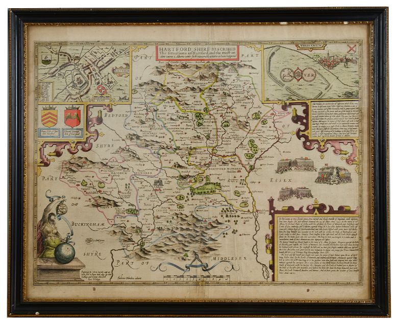 A 17th century double sided Map of Hertfordshire, engraving with later hand colouring, mounted in a Hogarth frame