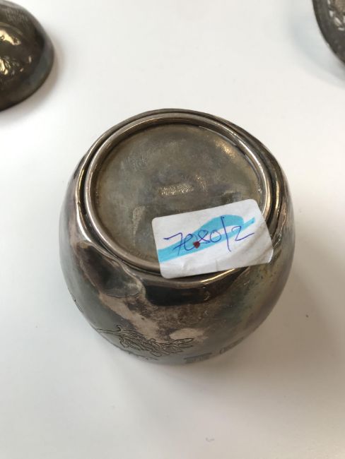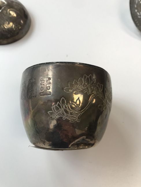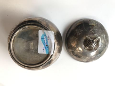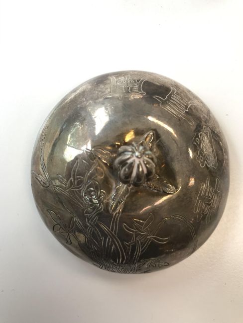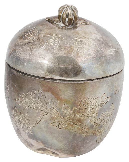 of spherical form, the domed cover with a bud finial, engraved with flowers and Chinese characters