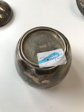Condition: Cover with dings and dents. Bud finial pushing cover. body with a large dent at base other shallower dents. Surface scratches and wear