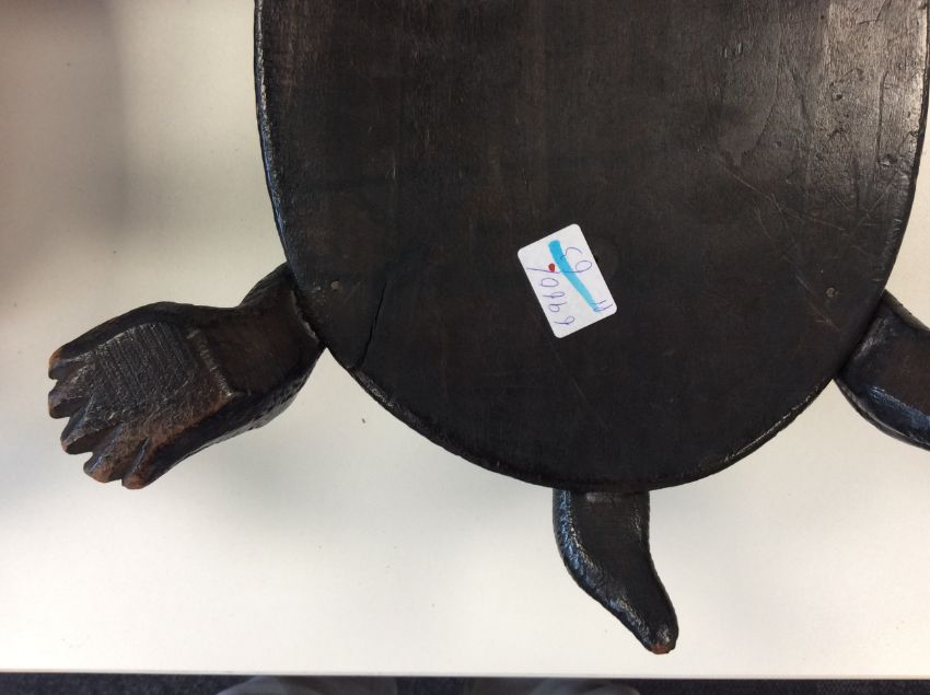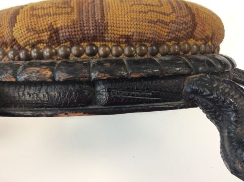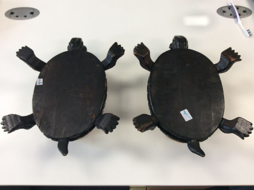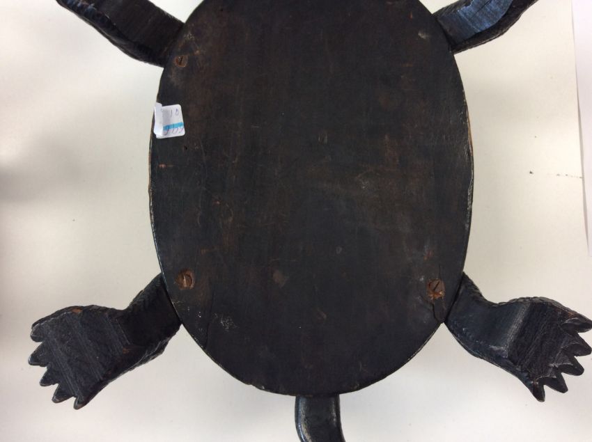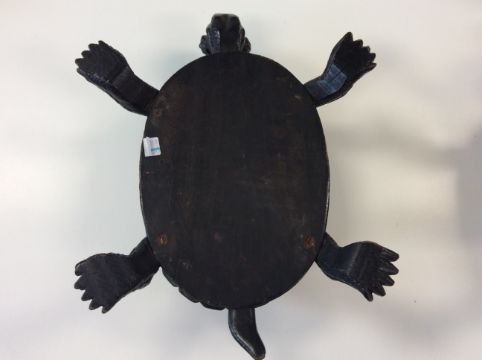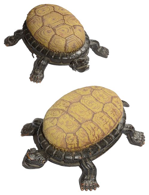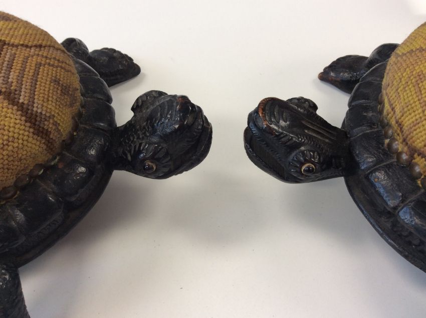 A pair of Victorian novelty ebonised tortoise footstoolseach with witch carved feet head with glass eyes, upholstered with simulated shell tapestry (2)length 44 cmFair condition. Ebonised decoration slightly rubbed. Slight knocks. One Tortoise has three legs that have some movement and have also been later screwed. There is a small split on the underside near one leg.