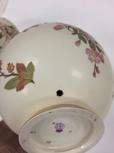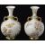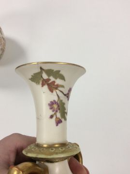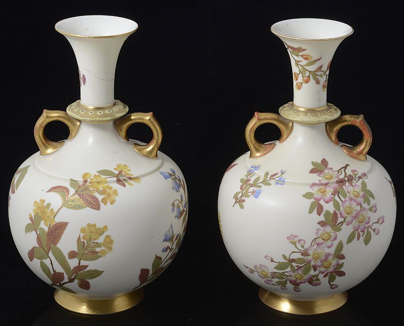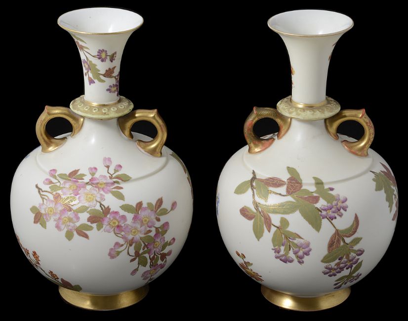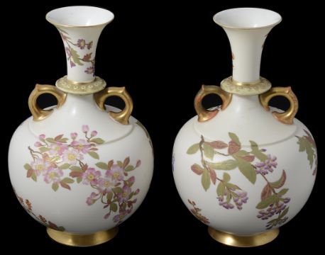 A matched pair of Royal Worcester blush Ivory twin handled vases, circa late 19th Centurydecorated with gilded floral sprays and garlands, bulbous form, puce backstamp and impressed stamp to underside (2)height approx: 26cmCondition: One vase has a been repaired at the neck. The whole top has been knocked off in two places and repaired. This vase has also been drilled. The other vase would appear to have one handle that has been re gilt rather poorly. There are other areas of wear the gilt is rubbed .