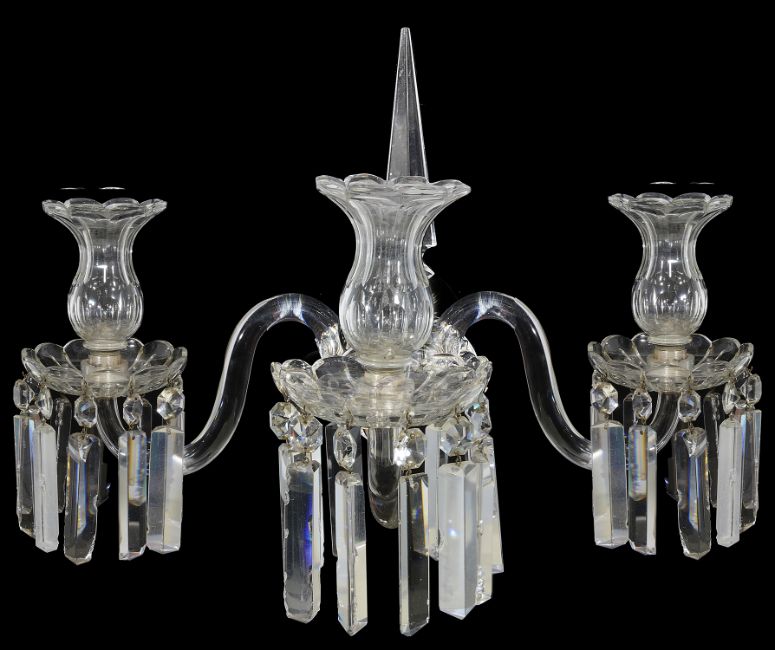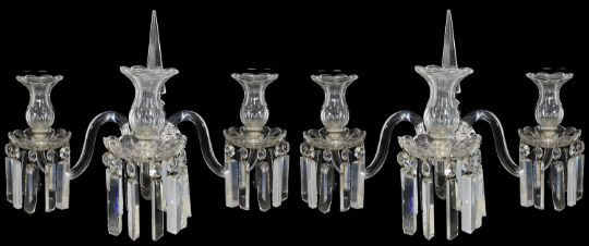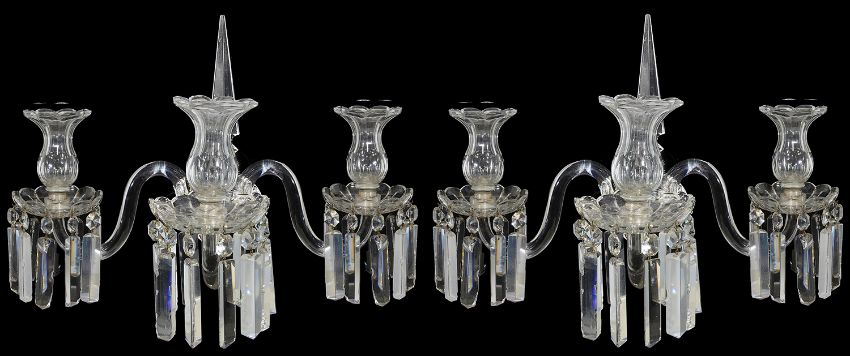 A pair of late Regency cut glass three light wall appliques in the manner of Osler