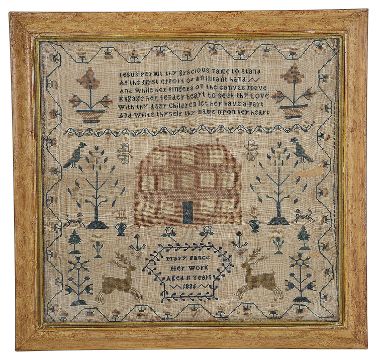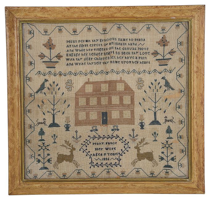 worked in coloured threads by Mary Pance aged 11, depicting a house flanked by trees, butterflies, birds and dogs, the upper section with a poem, and the lower section with central named panel flanked by leaping deer, in square maple frame