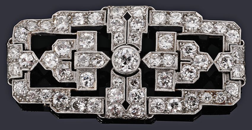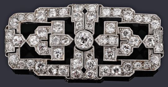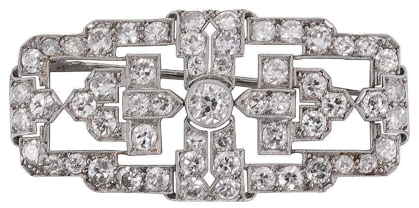 An Art Deco diamond set double clip broocha central old European cut diamond, miligrain set to an open geometric border of circular old cut diamonds, all grain set to a white frame, with pin and ‘C’ scroll brooch fitting and safety chain, marked PT, Total diamond weight approx: 5.22cttotal weight: 10.0g Condition: tested and valued as PlatinumCentral diamond measurements: 4.68mm x 4.88mm x 3.12mmEstimated diamond weight: 0.46ct (limitations due to setting)Total diamond weight approx: 5.22ctgood condition, clasp is loose and may require tightening, some light surface scratches, good, very small split to the gallery
