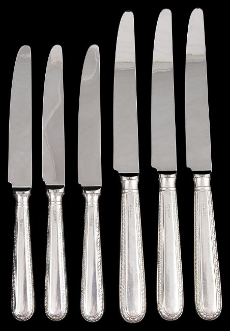A set of thirteen silver handled Feather Edge pattern table and dessert knives with stainless steel blades