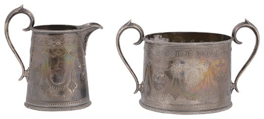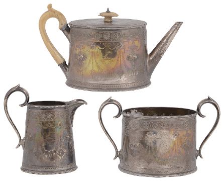 of oval design, embossed and engraved with swags and foliate decoration, with beaded rims, comprising teapot fitted with ivory scroll handled and knop finial, engraved with presentation inscription, twin handled sugar bowl and milk jug, crested and bearing initials, (3)