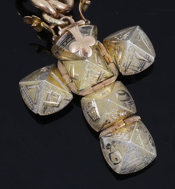 with t-bar, two swivel clips and an articulated Masonic ball fob enclosing four Masonic symbols marked 9ct